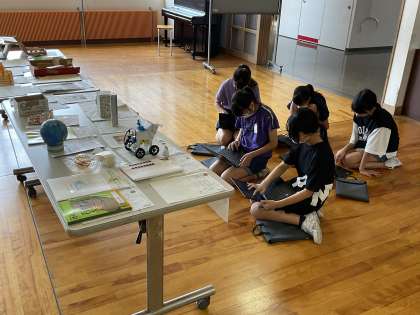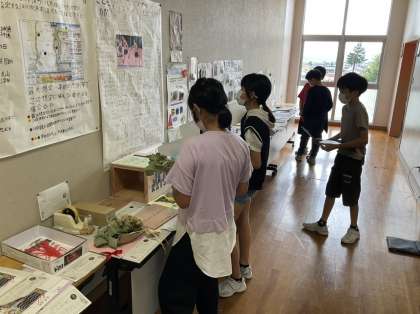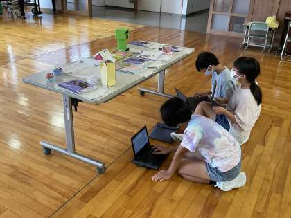校内作品展の最終日。下級生が夏休みにがんばってきたことや作品のよさなどを見付けに、他学年の作品展を見に行きました。一人一人がクロームブックを使い、思ったことを書き込んでいます。