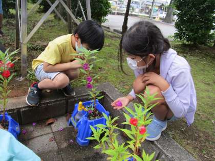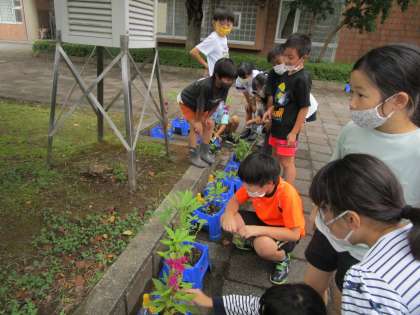 6月に植えた植物たちもだいぶ大きくなり、生長ぶりを観察しました。 実の中に種があることも確認しました。