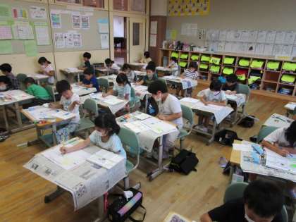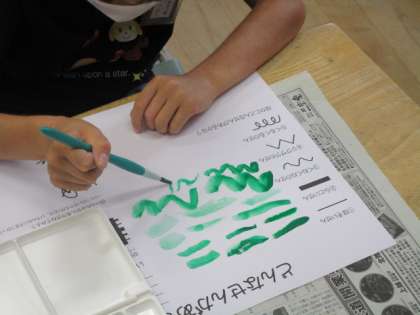 1年生 図画工作科 えのぐとなかよし2 公開日 2021/09/08 更新日 2021/09/08 1年生 今日は、水彩絵の具を使い、いろいろな線を引きました。 まっすぐな細い線と太い線、くねくねやかくかくの線など、筆1本でいろいろな線が描けることを確かめました。