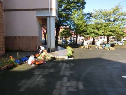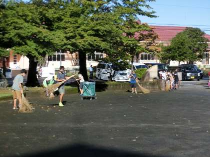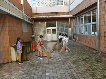 5・6年生が、朝の玄関掃除をしています。みんなが通う学校のために、進んで働く姿がすばらしいですね。