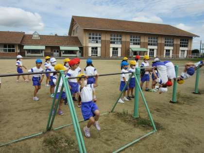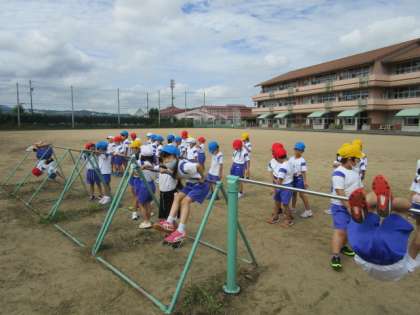 鉄棒に挑戦中です。こうもりや地球周りなど、手や足を離す技をするときはどきどきしますが、勇気を出して頑張っています。