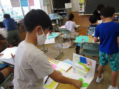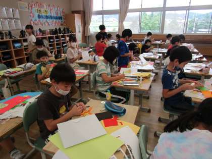 敬老の日におじいちゃん、おばあちゃんにプレゼントをするために図工の時間に飛び出すカードを作っています。