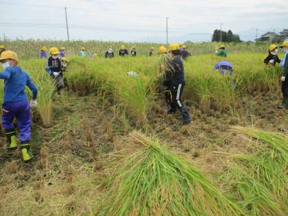 5年生 稲刈り 4 公開日 2021/09/14 更新日 2021/09/14 5年生 2時間目と3時間目に5月に田植えをした田んぼの稲を刈りました。 友達と競ったり、力を合わせたりしながらがんばりました。