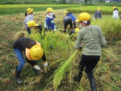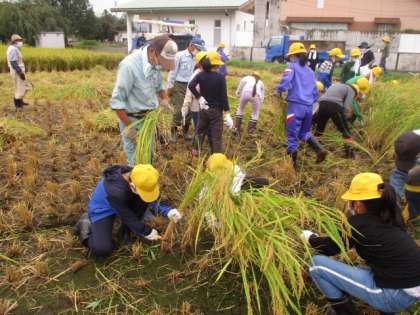 刈り残しがないように、みんなで声を掛け合いながら協力して稲を刈り取ります。