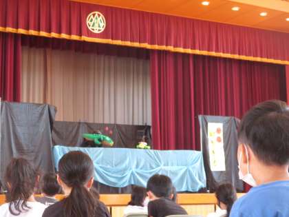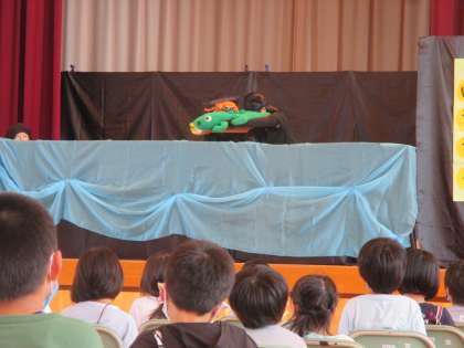 4限は、体育館で、こでまりの会による「サルのいきぎも」の人形劇を鑑賞し、ワニとサルのやりとりを楽しみました。鑑賞した後、子供たちから「こでまりの会の皆さんのように、気持ちを込めて音読したいな」「自分でお話をつくってみたくなったよ」という声が聞こえてきました。