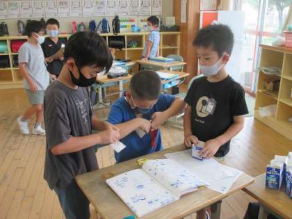 先週末から、「つくってあそぼう うごくおもちゃ」の学習を始めました。昨日、つくりたいおもちゃでグループを決め、今日からグループに分かれて活動しました。グループで話し合い、協力して進めていました。