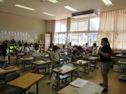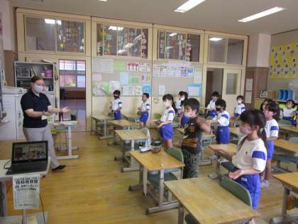 1年竹組 外国語活動 公開日 2021/09/24 更新日 2021/09/24 1年生 初めての外国語活動でした。新しくいらっしゃったエミリー先生と、緊張した様子で歌っていましたが・・・後半のビンゴゲームでは、笑顔があふれ、エミリー先生に積極的に話しかけていました。