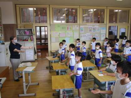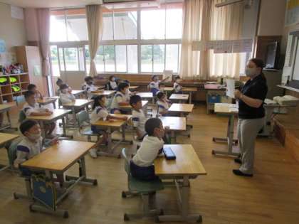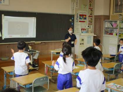 1年生松組 初めての外国語活動 公開日 2021/09/24 更新日 2021/09/24 1年生 ALTのエミリー先生と、初めての外国語活動をしました。 始めは、緊張し、どう反応していいか戸惑っていましたが、動物の名前や色の名前等、聞いたことのある英単語が出てくると、「知っとるー」と元気よく発音することができました。 あっという間に終わりの時間となり、「またやりたい」「楽しかった」と笑顔の子供たちでした。