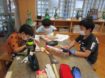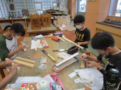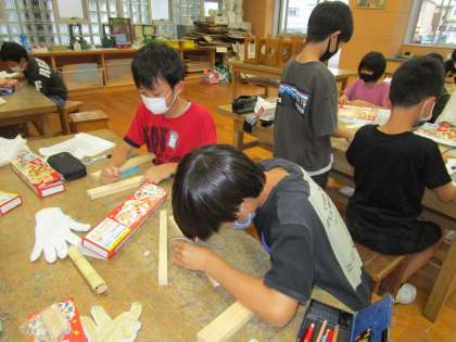 作りたいものを考えて、その形に合わせて切りたいところに線を引き、のこぎりで切りました。