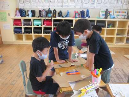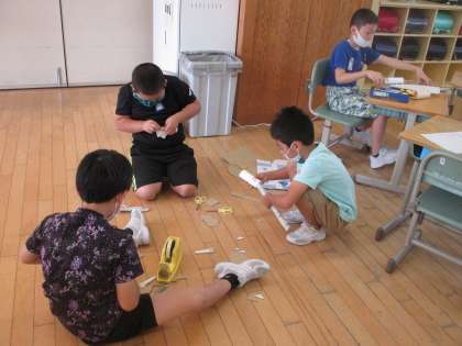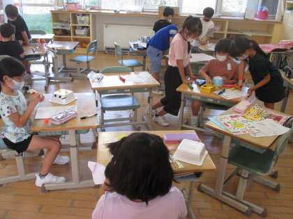 2年生 生活科「つくってあそぼう うごくおもちゃ」 公開日 2021/10/05 更新日 2021/10/05 2年生 同じグループの友達とアイディアを出し合い、よりよくなるように工夫しながら進めています。