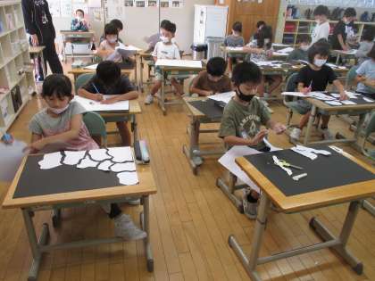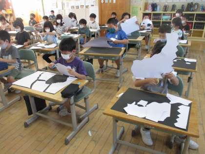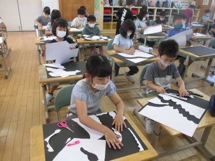 2年生 図工「はさみのあーと」 公開日 2021/10/07 更新日 2021/10/07 2年生 はさみで白い紙を思いのままに切って、黒い紙の上に置き、何に見えるか考えながら進めました。どんな面白い形ができるかワクワクしながら、作品を仕上げていました。