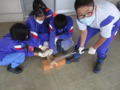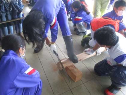 5年生 体験学習 コースター作り 公開日 2021/10/13 更新日 2021/10/13 5年生 午前中はコースター作りを行いました。 班のみんなで協力して丸太を押さえたり、励まし合ったりして自分だけのコースターを作ることができました。