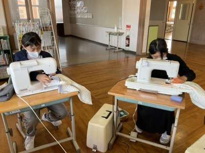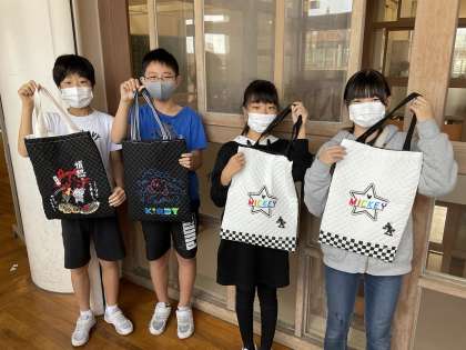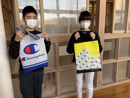 家庭科の学習では、手縫いをしたりミシンを使ったりしてトートバッグを作りました。完成させることができて、子供たちは嬉しそうです。