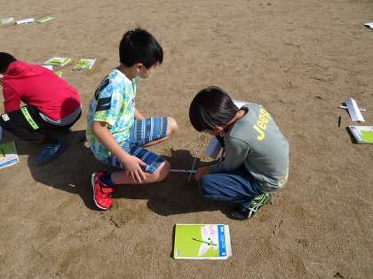 日なたと日かげの地面の温度を測りました 温度の違いに驚いていました。