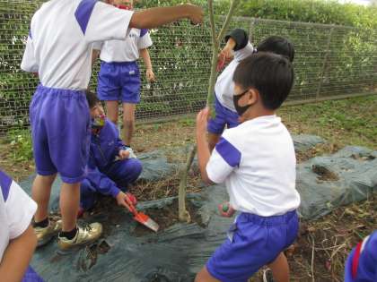 2年生 生活科 畑の片付け 公開日 2021/11/08 更新日 2021/11/08 2年生 1学期から大切に育ててきた野菜の畑やプランターの片付けをしました。一番大変だったのはオクラの片付けで、「大きくて一人ではひっこ抜けない」「とげがあってあぶないよ」と協力して片付けました。