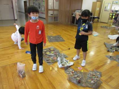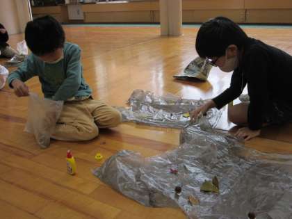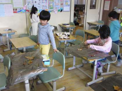 学校や家で集めた落ち葉や木の実を使って、帽子と服を飾り付けしています。