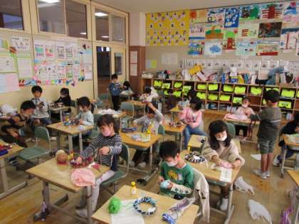 1年生 生活科 あさがおのリース飾り付け 公開日 2021/11/17 更新日 2021/11/17 1年生 先月作ったあさがおのリースに飾りを付けました。 木の実や各家庭から持ってきた材料を、思い思いに使いました。
