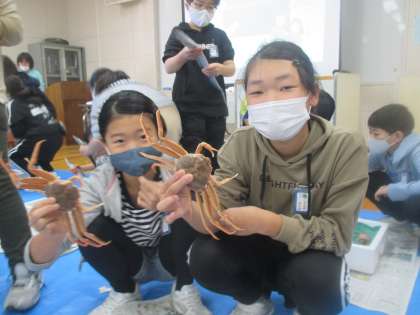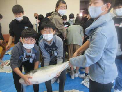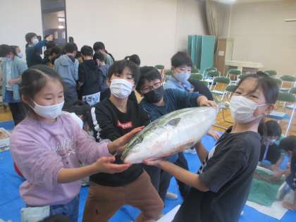 富山湾で捕れる魚について学習しました 4 公開日 2021/11/17 更新日 2021/11/17 5年生 みんなでかにを触ったり、力を合わせてぶりを持ち上げたりしました。 ぶりの大きさ、重さに感動する姿が見られました。