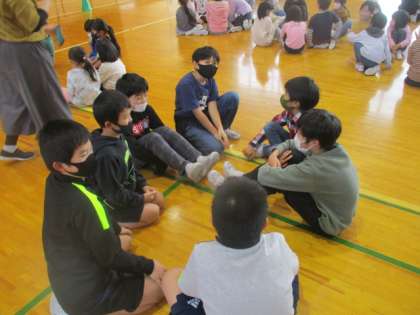 児童集会で「もうじゅうがり」のゲームを楽しみました。 いろいろな学年と進んで関わる姿がたくさん見られました。