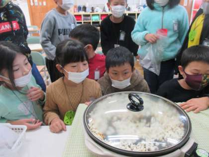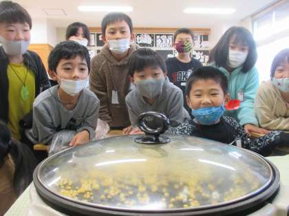 2年生 生活科 野菜の収穫パーティー 松組 その2 公開日 2021/11/25 更新日 2021/11/25 2年生 トウモロコシの実で、ポップコーンも作って食べました。ホットプレートで温めると、ポンポンと弾ける様子に興味津々。塩をかけて、美味しく食べました。 つくった焼き芋とポップコーンを、お世話になっている先生方にもプレゼントすることができました。