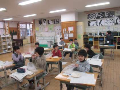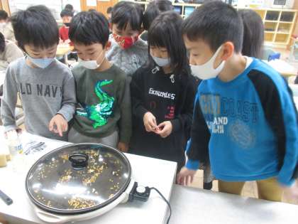 ポップコーントウモロコシの実でポップコーンも作って食べました。少しずつはじけてくるポップコーンをじっと眺めていました。塩味のポップコーンをみんなで美味しく食べました。