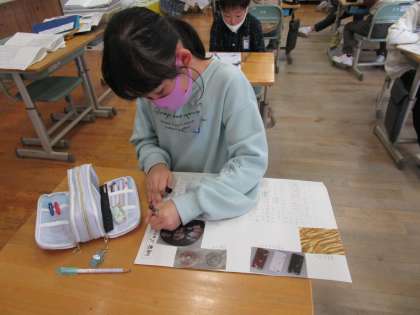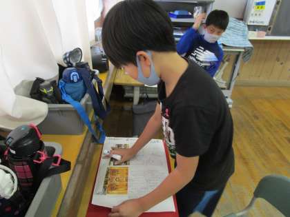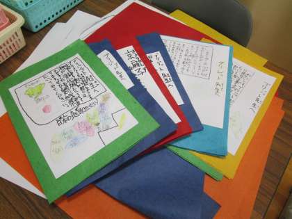 4年生 国語:伝統工芸のパンフレット作り 公開日 2021/12/02 更新日 2021/12/02 4年生 外国語活動で教えてもらっているALTの先生に日本の伝統工芸について知らせようというめあてで作ってきたパンフレット作りでは、完成した人が増えてきました。文章を書いた紙を和紙でできた台紙に貼ったり、タイトルを丁寧に書いたりして仕上げました。