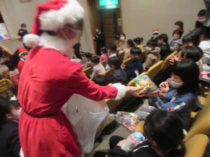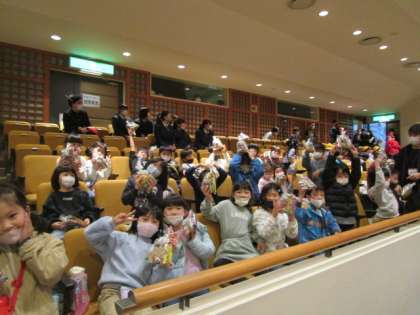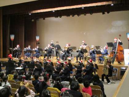 ブラスバンド部の演奏にノリノリになり、最後にはプレゼントとして、お土産のお菓子をもらいました。