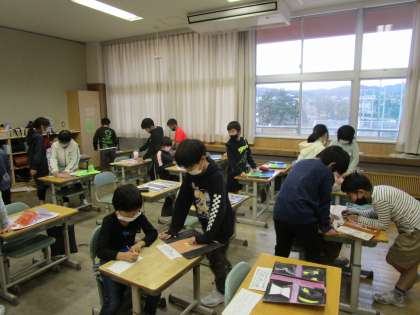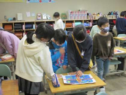3年生 鑑賞タイム 公開日 2021/12/13 更新日 2021/12/13 3年生 がんばって仕上げた図工の作品をクラスで鑑賞し合いました。 友達がつくった扉を開いて、出てくる絵を楽しんでいました。