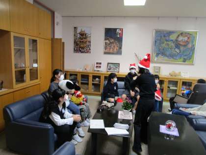 12月の日本語名人に合格すると、すてきなサンタ帽子を被って記念写真を撮ることができます。勇気を出して挑戦する6年生です。
