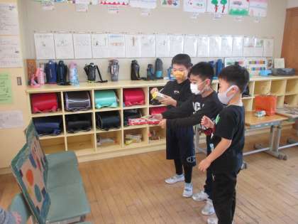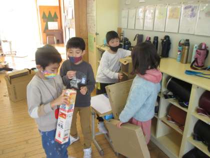 2年生 生活科 おもちゃ作り 公開日 2021/12/14 更新日 2021/12/14 2年生 他のグループのおもちゃで遊んでみたり、さらにより良いおもちゃにするために改良を進めています。他のグループを見て、「もっとおもちゃを頑丈にしよう!」「看板が必要だね。」と言いながら協力しています。