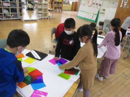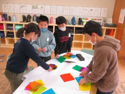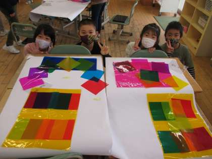 2年生 図工「いろの見えかた むげんだい」松組 公開日 2021/12/16 更新日 2021/12/16 2年生 今日は、セロハンを使って学習しました。重ねた部分の色が変わったり、違う形に見えたりすることに気が付き、いろいろな作品を楽しく作る姿が見られました。最後には、教室の窓をセロハンを使って飾り付けすると、光が差し込み、セロハンの色のきれいな影が床に映り、「わぁ、きれい!」と歓声が上がりました。