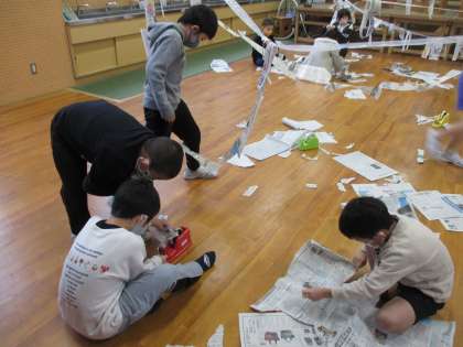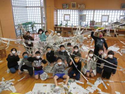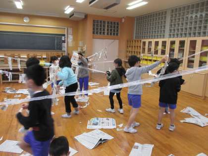 2年生 図工「つないで つるして」松組 公開日 2021/12/17 更新日 2021/12/17 2年生 新聞紙やチラシを細長くちぎって、図工室いっぱいに吊したり繋いだりしました。できるだけ長くちぎる方法を教え合うなど、協力しながら作っていました。記念写真を撮った後は、力を合わせて素早く片付ける姿も見られました。