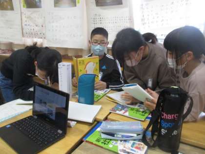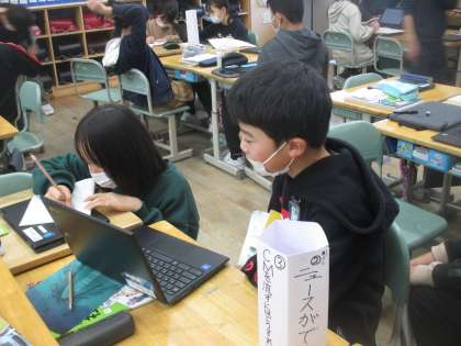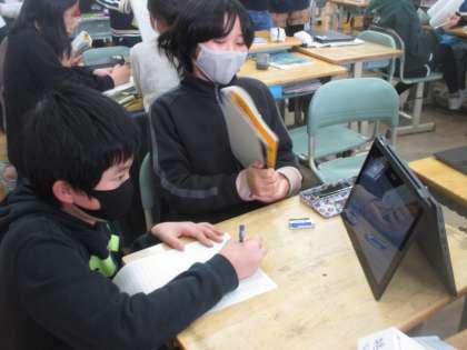 5年生 竹組 社会の発表3 公開日 2021/12/20 更新日 2021/12/20 5年生 「私がメモするスピードに合わせて話してくれた!」 「ぼくが調べたものより詳しかった!」 友達の発表のよさをたくさん見付けていました。