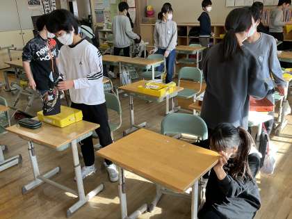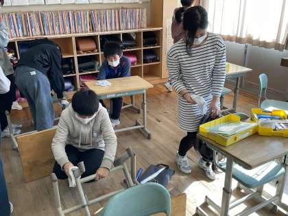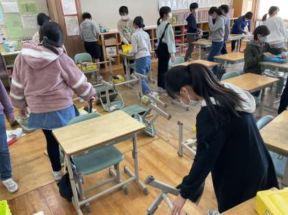 自分たちが使わせてもらっている教室の机や椅子、ロッカーなどの埃を取ったり水拭きをしたりしました。小学校生活最後の3学期。きれいな教室(机や椅子)で、スタートを切れるように、一人一人が掃除に取り組んでいました。