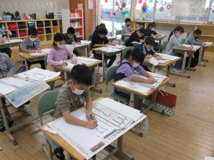 2年生 始業式・書初大会 公開日 2022/01/11 更新日 2022/01/11 2年生 2年生全員が揃って、3学期を迎えることができました。始業式では、最初に入場して校歌を練習したり、よい姿勢で真剣に話を聴いたりする姿が見られました。書初大会では、練習の成果を発揮して、集中して丁寧に一字一字書いていました。 3学期も、ご協力よろしくお願いいたします。