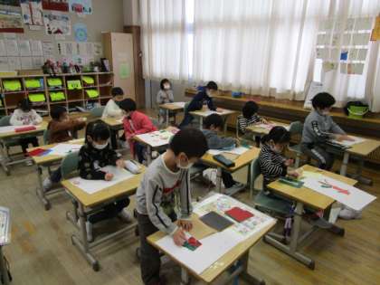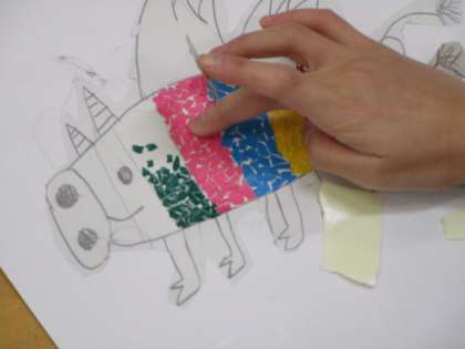 今日は全員が下書きを仕上げ、カラータックという色の付いたシールで着色する作業に進みました。小さくちぎって貼っていくコツコツした作業の様子を見ると、一人一人の個性が見られます。
