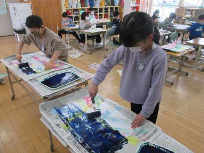 2年生 図工「たのしくうつして」 公開日 2022/01/20 更新日 2022/01/20 2年生 シールを貼り終わり、今日は藍色の絵の具をローラーで塗りました。絵の具が乾いて、シールを剥がすことを楽しみにしている子供たちです。