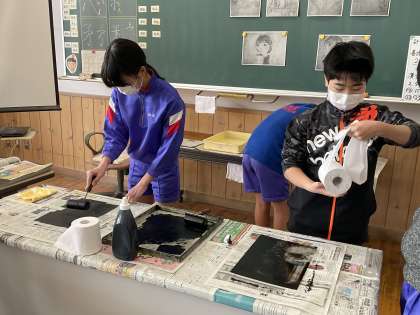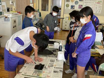 版を彫り終えた子供から順に、刷り始めました。初めての作業で慣れないこともありますが、友達の様子を見てやり方を学んでいます。