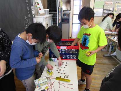 3年生 電気を通すもの 公開日 2022/02/01 更新日 2022/02/01 3年生 空き缶、硬貨など、身近にある様々なものが電気を通すのかどうか実験しました。 さて、どんなものが電気を通したのでしょうか。