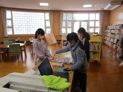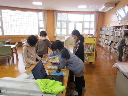 4年生は、6日の学習発表会の「委員会の魅力を伝えよう」の学習に向けて図書室で本を借りつつ、図書委員会さんの貸し出しの仕事もしっかり見てきました。