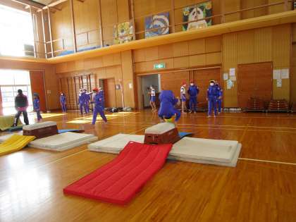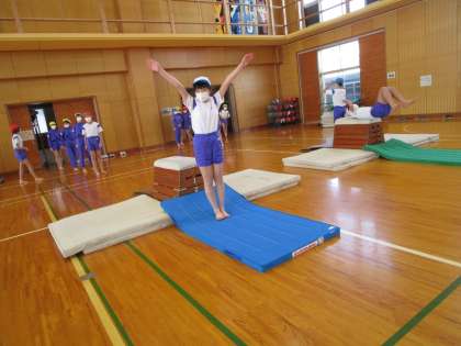 台上前転に挑戦です。始めはうまく回転できなかった人も、コツをつかんできています。