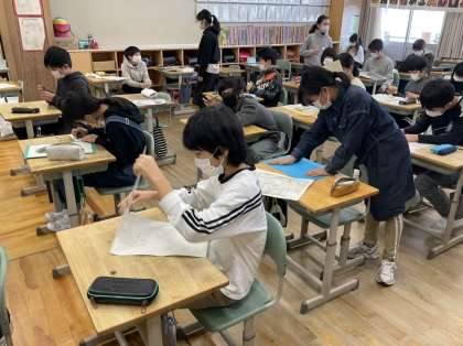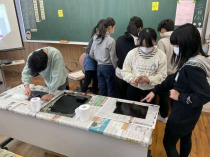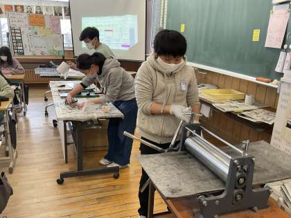図画工作科のドライポイント制作は、大詰めを迎えています。ニードルで彫ったところにインクを入れ、プレス機で刷り上げていきます。