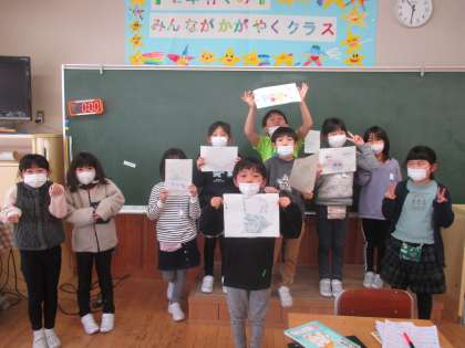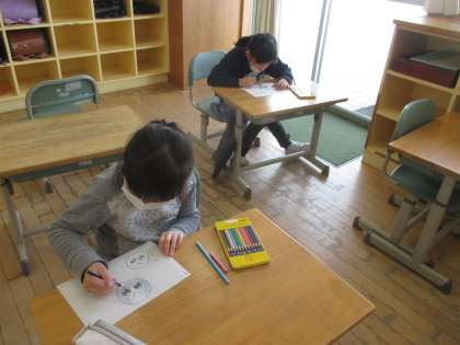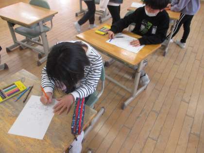 2年生 係活動 竹組 公開日 2022/02/08 更新日 2022/02/08 2年生 イラスト係が企画した3色マーカーチャレンジがのびのびタイムに開催されました。目を閉じて選んだ3色の色鉛筆を使って、イラスト係が描いた絵に色を塗りました。参加者とイラスト係の様子です。