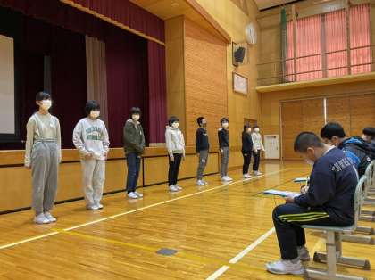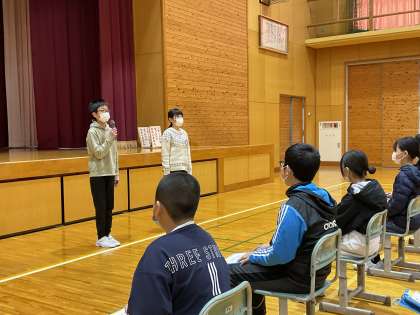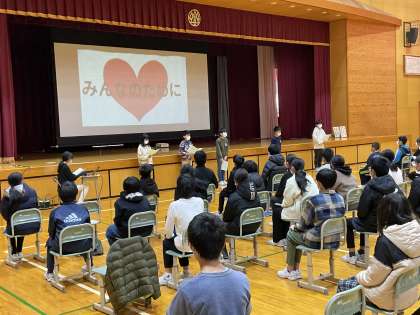 バトンタッチ集会では、6年生から5年生に向けて、これまで取り組んできたことを紹介したり最高学年としての思いを伝えたりしました。