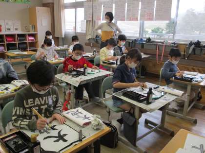 とうとう4年生最後の習字の時間になりました。大地という字をていねいに書いていました。なぞり書きの後、清書しました。