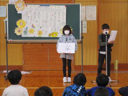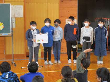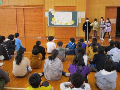 集会係が司会進行をしました。始めに、読み聞かせ係が作った紙芝居をみんなに読んで聞かせました。おもしろいお話にみんなが大笑いをしました。クイズ係からのクイズは、難問もあり、正解者へ「オー」という歓声を上げていました。