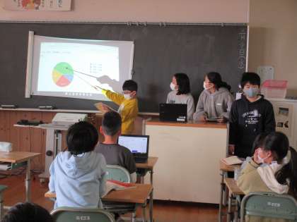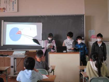 クラス全員にアンケートを取り、結果から分かったことをグループで発表しました。放課後の過ごし方や嫌いな食べ物、メディアの使用について、結果が分かるグラフを見せながら、みんなに話しました。一人一人が自信をもって上手に話していました。