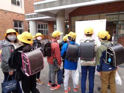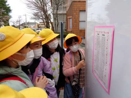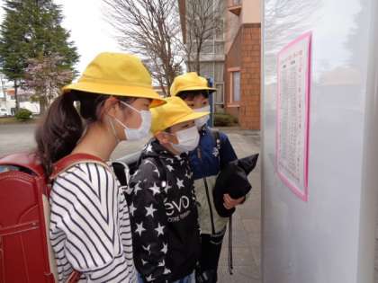登校後、ドキドキしながら松組と竹組のクラス分けがしてある名簿を見て、自分の名前を見つけていました。