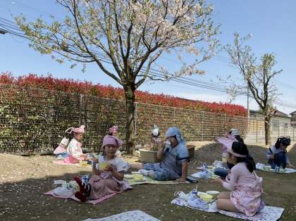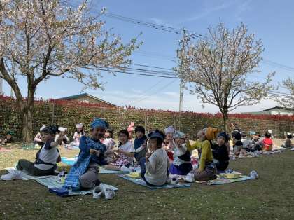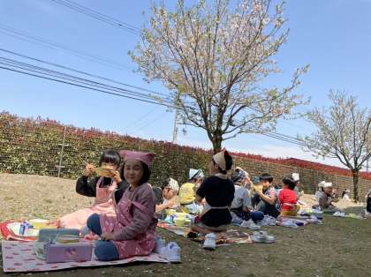 今日は、2年生教室のベランダから見える桜の木の近くで、お花見をしながら給食を食べました。