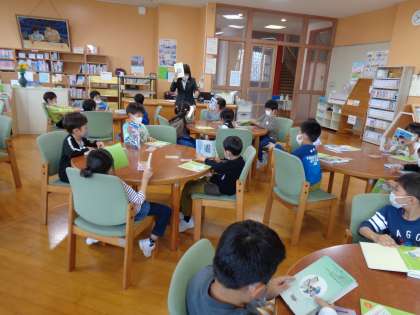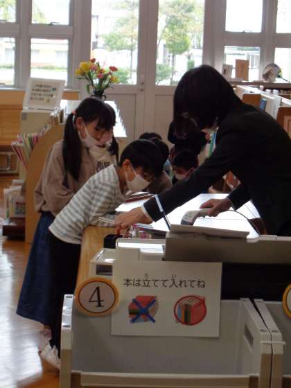 1年生竹組 図書オリエンテーション 公開日 2022/04/19 更新日 2022/04/19 1年生 司書の先生から、図書室の使い方を教えていただきました。表紙にはバーコードが付いていて、背表紙にはラベルは貼っている本が学校の本です。 自分の読みたい本を2冊選んで、実際に借りることができました。